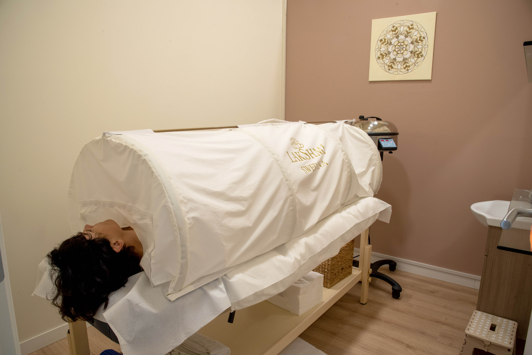 Il bagno di vapore Swedana è una sauna da praticare comodamente sul lettino. Quando utilizzato durante un trattamento con fango o bendaggi, ne potenzia l’efficacia: il vapore, dilatando i pori, favorisce l’assorbimento dei principi attivi.